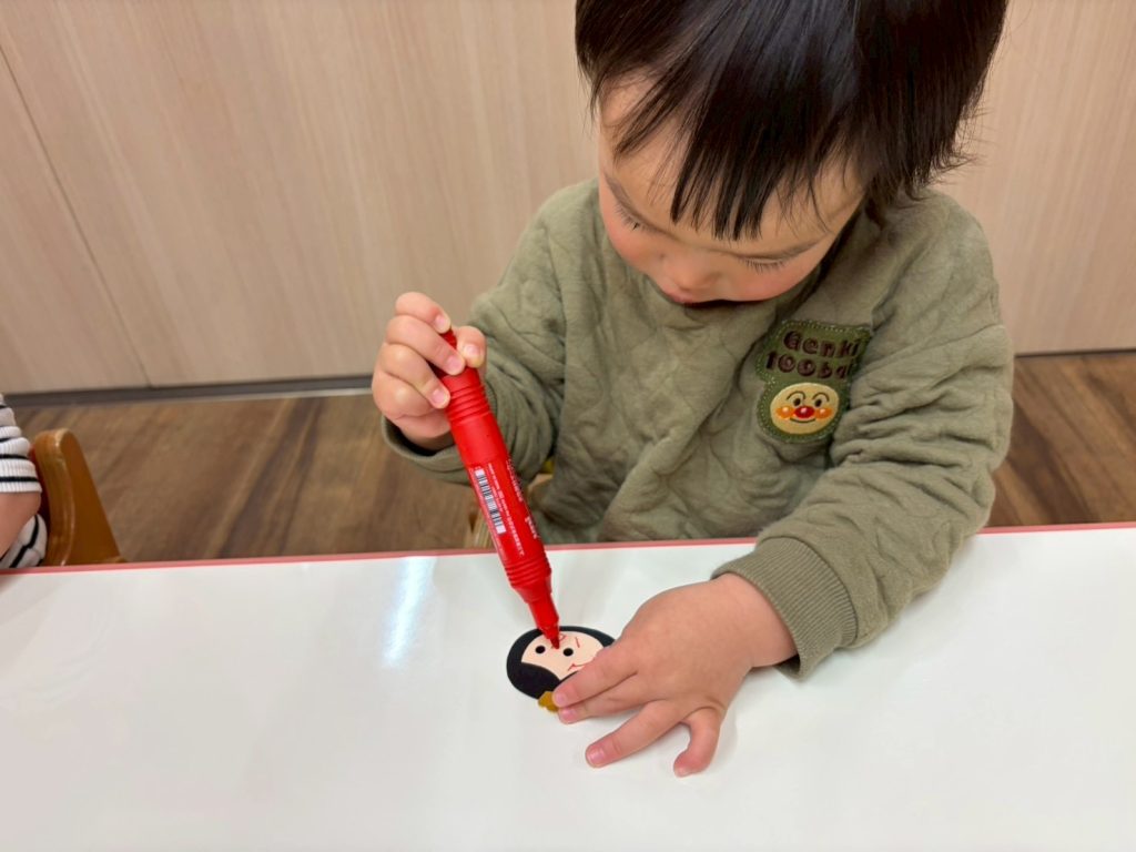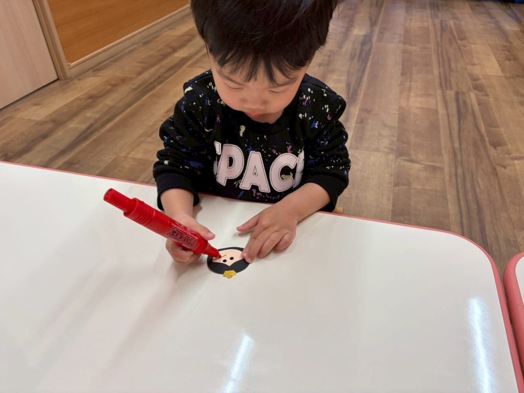 うさぎ組さんは…目はシールを貼って、口ははじめてペンで書いてみました☺︎
