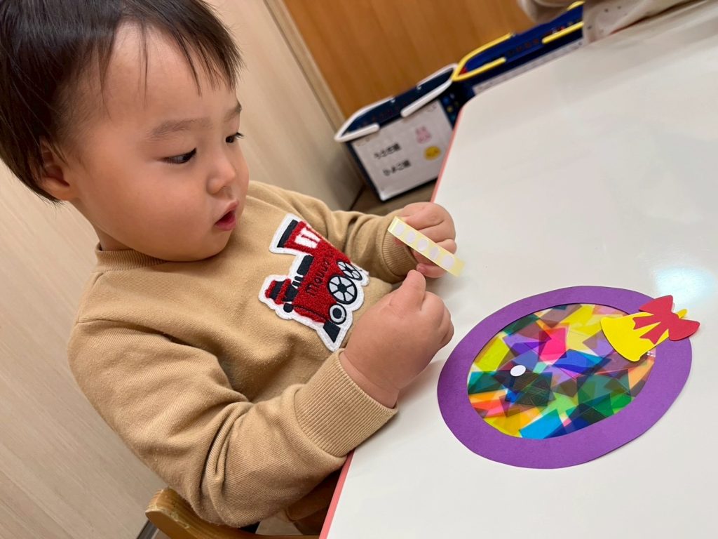 うさぎ組さんは好きな色の透明の折り紙を選びながらペタペタと貼ってステンドグラス風に…♡