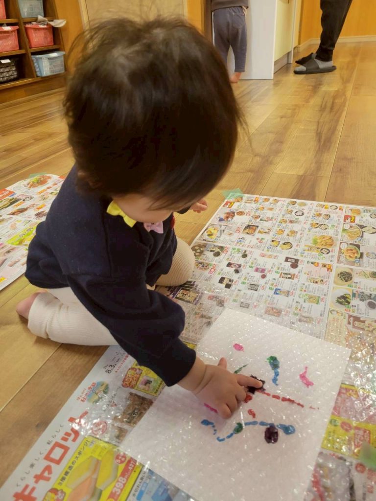 ひよこ組さんはプチプチ(気泡緩衝材)を使って絵の具を押して、感触を楽しんだり、色が伸びるのを楽しみました😊